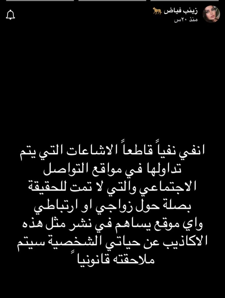 زينب فياض كتبت منشور عبر حسابها على موقع التواصل الإجتماعي انستغرام تنفي فيه الإشاعات المتداولة حول إرتباطها وزواجها مهددة مروجوها باللجوء إلى القانون قائلة : ” انفي نفيا قاطعا الإشاعات التي يتم تداولها في مواقع التواصل الإجتماعي والتي لا تمت للحقيقة بصلة، حول زواجي او إرتباطي وأي موقع يساهم في نشر مثل هذه الأكاذيب عن حياتي الشخصية سيتم ملاحقته قانونيا”.