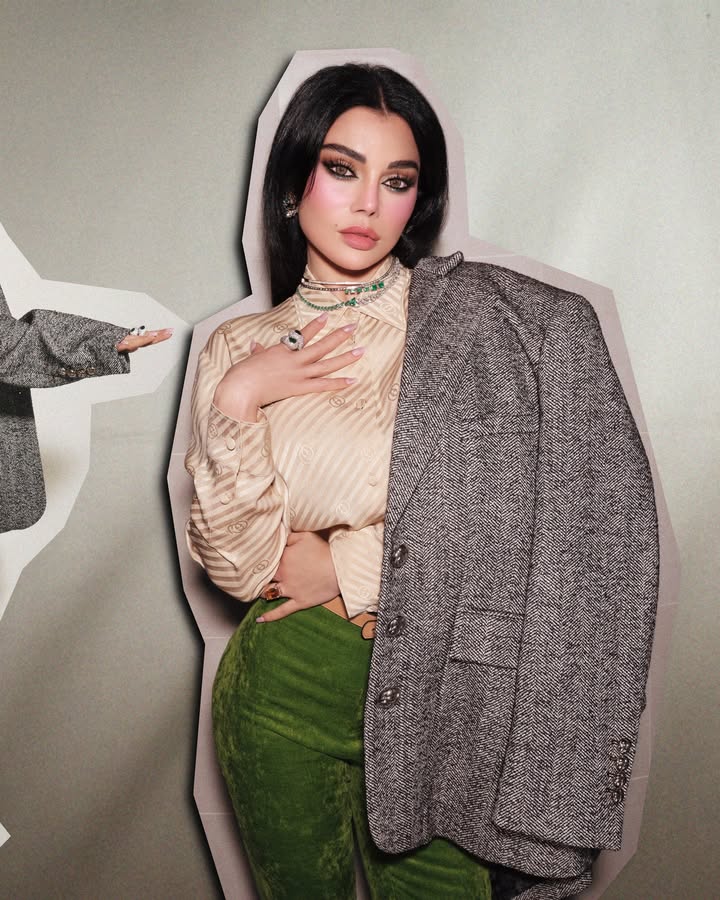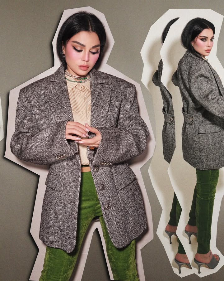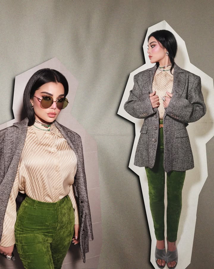 وإستعرضت هيفاء وهبي إطلالتها القائمة على فكرة ” الستريكرز” الأمر الذي منح لوكها مظهرها مميزا خارجا عن المألوف حيث إرتدت قميص بقصة كلاسيكية بأكمام بطويلة بخامة حريرية باللون البيج جاء بياقة ناعمة وبخطوط خفيفة ونقوشات شعار “غوتشي” نسقت معه بليزر بتصميم واسع Oversized باللون الرمادي مطبوع بنقشة الشيفرون الأيقونية وإرتدت بنطلون ضيق باللون الأخضر جاء بخامة المخمل .