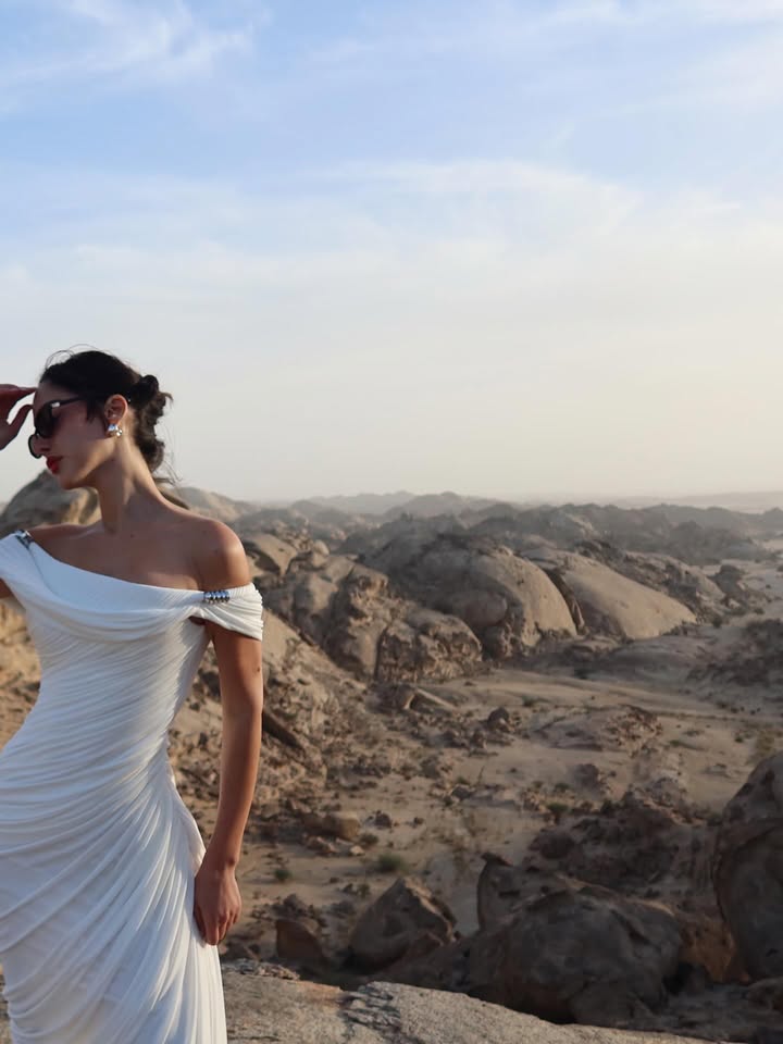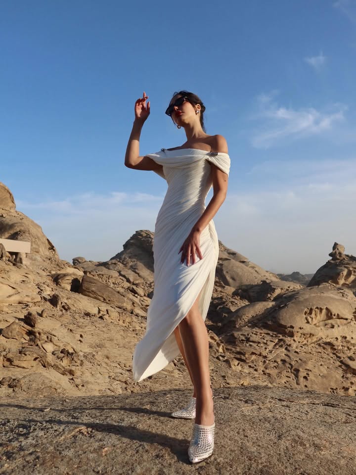شاركت الفنانة المغربية بسمة بوسيل متابعيها عبر حسابها على موقع التواصل الإجتماعي انستغرام صور جديدة لها، من أحدث جلسة تصوير خلال تواجدها في منتجع ديزرت روك الجبلي المتواجد في منطقة تبوك بالمملكة العربية السعودية ، حيث خطفت الأنظار بإطلالة أنيقة للغاية مرتدية فستان أبيض ضيق وطويل جاء بتصميم إنسيابي وبقصة الكتف الواحد الأمر الذي أبرز جمال قوامها الرشيق ونسقت إطلالتها مع إكسسوارت عبارة عن نظارات شمسية عصرية وحملت في يدها حقيبة صغيرة باللون البني أضافت لمسة فاخرة لإطلالة .