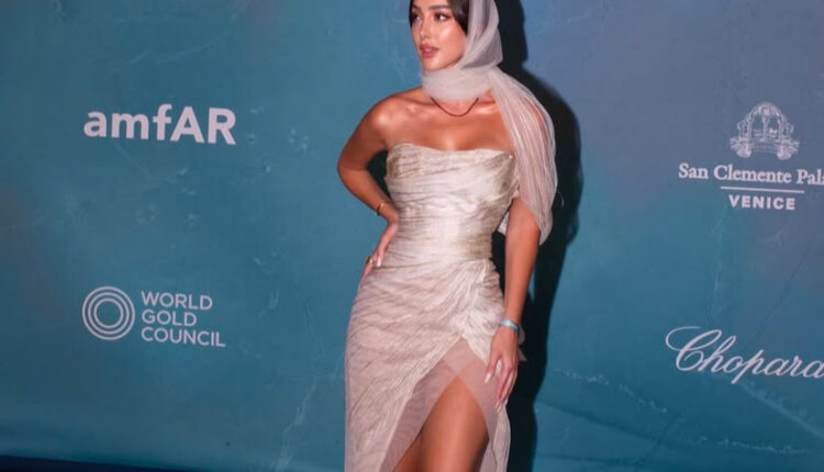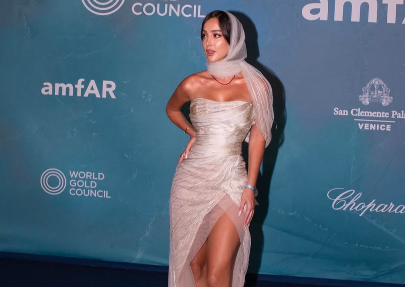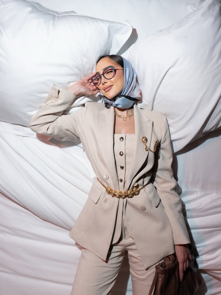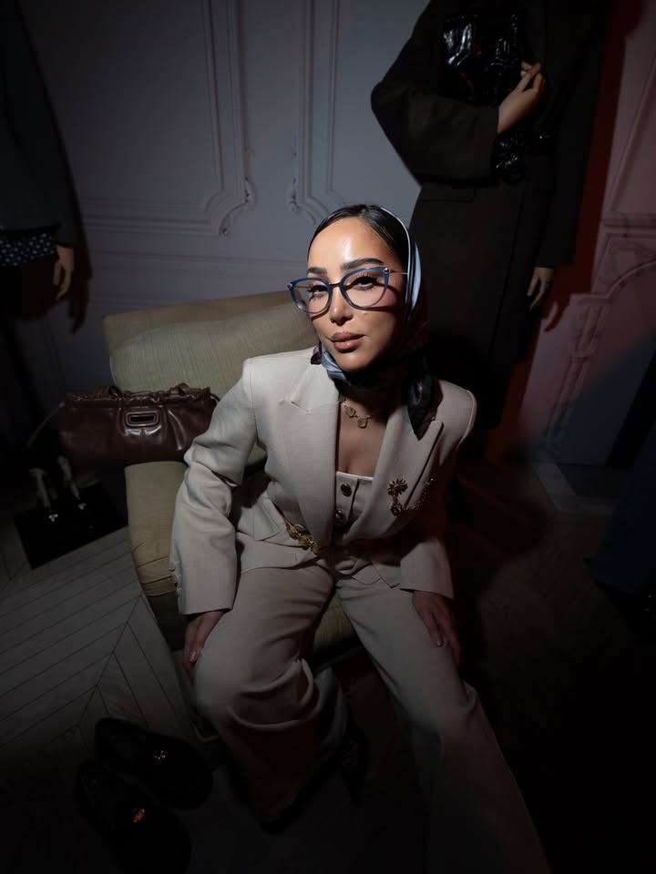 شاركت الفنانة المغربية بسمة بوسيل مؤخرا مجموعة من الصور عبر حسابها على موقع التواصل الإجتماعي انستغرام من إطلالاتها خلال حضورها عروض أسبوع الموضة في باريس لخربف وشتاء 2027 حيث ظهرت في إحدى الإطلالات مرتدية بذلة أنيقة باللون البيج نسقتها مع وشاح على الرأس باللون الأزرق السماوي، ووضعت نظارات على عينيها فبدت بغاية الأناقة كما تزينت بإكسسوارات ذهبية فريدة عبارة عن بروش وحزام باللون الذهبي، وحملت في يدها حقيبة باللون البني .