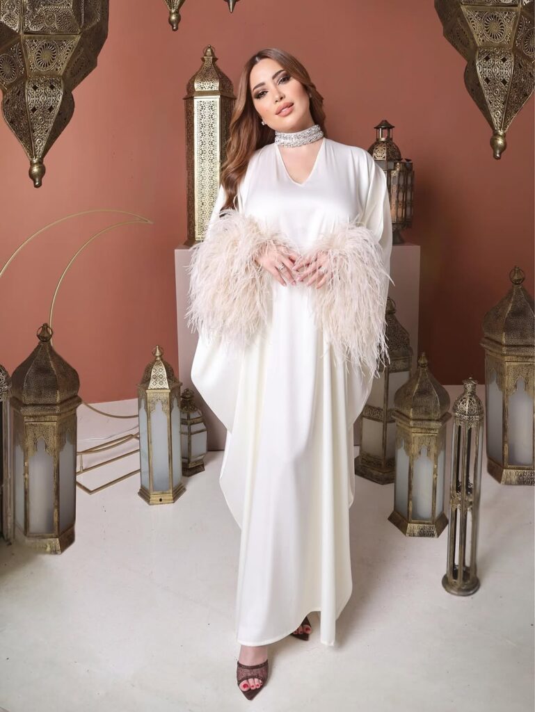 إحتفلت الفنانة السورية نسرين طافش بحلول شهر رمضان الكريم بإطلالة أنيقة خطفت فيها الأنظار ، مرتدية عباءة طويلة من قماش الساتان باللون الأبيض دون أي نقوشات او تطريزات جاءت بقصة عى شكل حرف v ناعمة عند منطقة الصدر وبأكمام طويلة مزينة بالريش الأبيض ، وظهرت وهي تحمل فانوس رمضان في إطلالة أنيقة و مميزة تناسب الشهر الكريم.