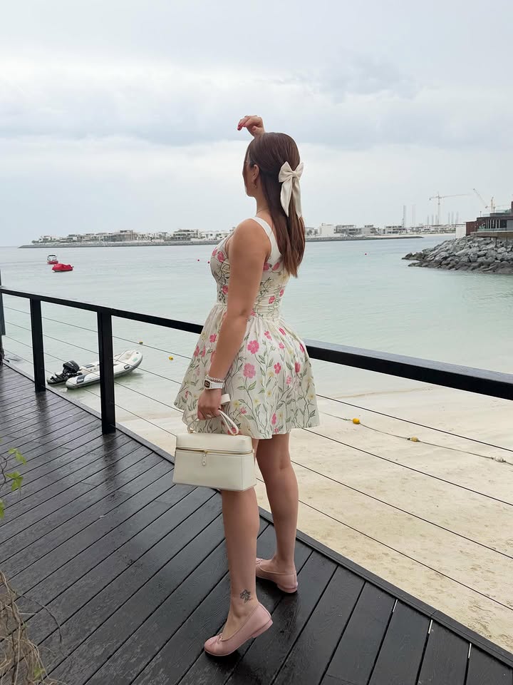 ومن حيث تنسيق الإطلالة، اعتمدت نسرين أسلوبًا بسيطًا وأنيقًا، إذ نسقت الفستان مع حذاء صيفي مريح بدون كعب باللون الوردي، ما أضفى لمسة ناعمة على اللوك. كما اختارت حقيبة يد فاخرة باللون الأبيض، إلى جانب ساعة أنيقة بنفس اللون وبعض المجوهرات الرقيقة التي أكملت الإطلالة دون مبالغة.
