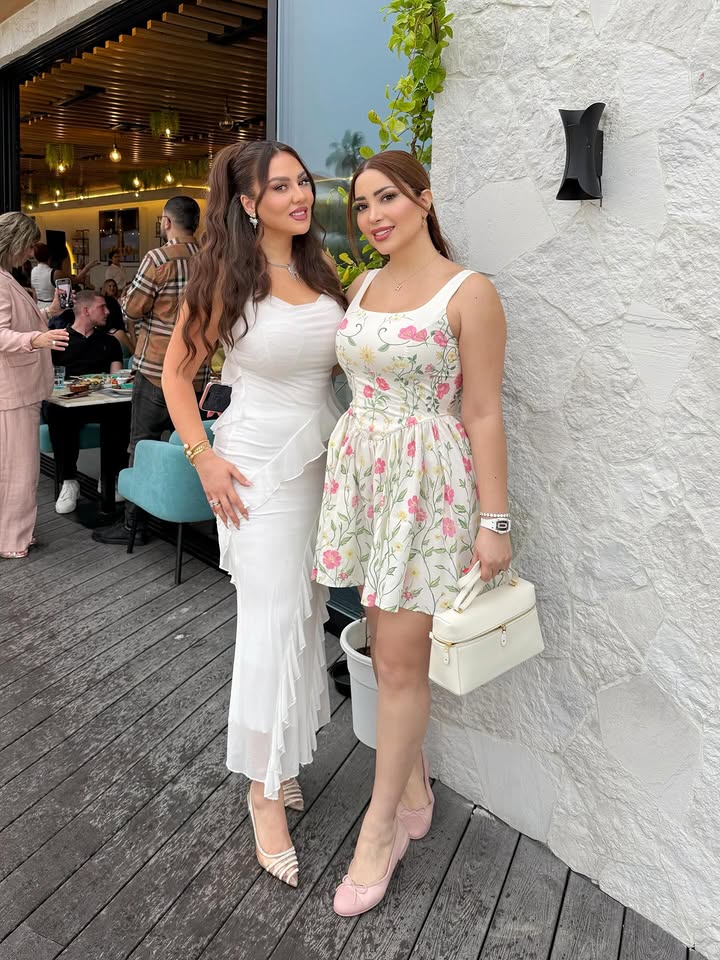 وظهرت نسرين طافش بفستان نهاري قصير باللون الأبيض، جاء مزينًا بنقوش الورود بألوان زاهية مثل الأصفر والأخضر والزهري، ما أضفى على إطلالتها لمسة منعشة ومليئة بالحيوية. تميز الفستان بتصميم بدون أكمام مع حمالات عريضة، حيث جاء ضيقًا من الجزء العلوي ليبرز رشاقتها، بينما انسدل بشكل فضفاض من الأسفل ليمنحها راحة وأناقة في آن واحد، وهو ما يجعله خيارًا مثالياً لإطلالات الربيع والصيف.